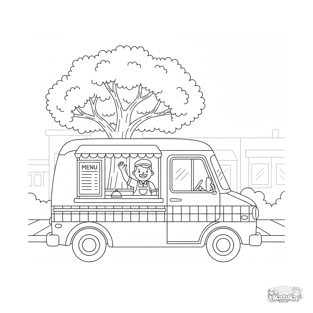 Página para colorear para niños de 4-6 años: un encantador camión de helados retro con patrón de cuadros está aparcado bajo un gran árbol en una calle soleada.