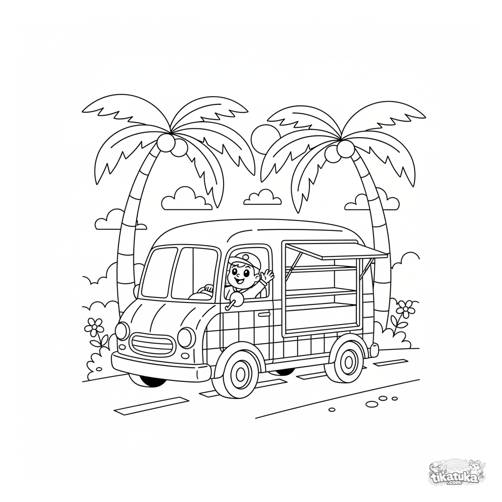 Página para colorear de un camión de helados retro estacionado bajo palmeras. Para niños de 4 a 6 años.