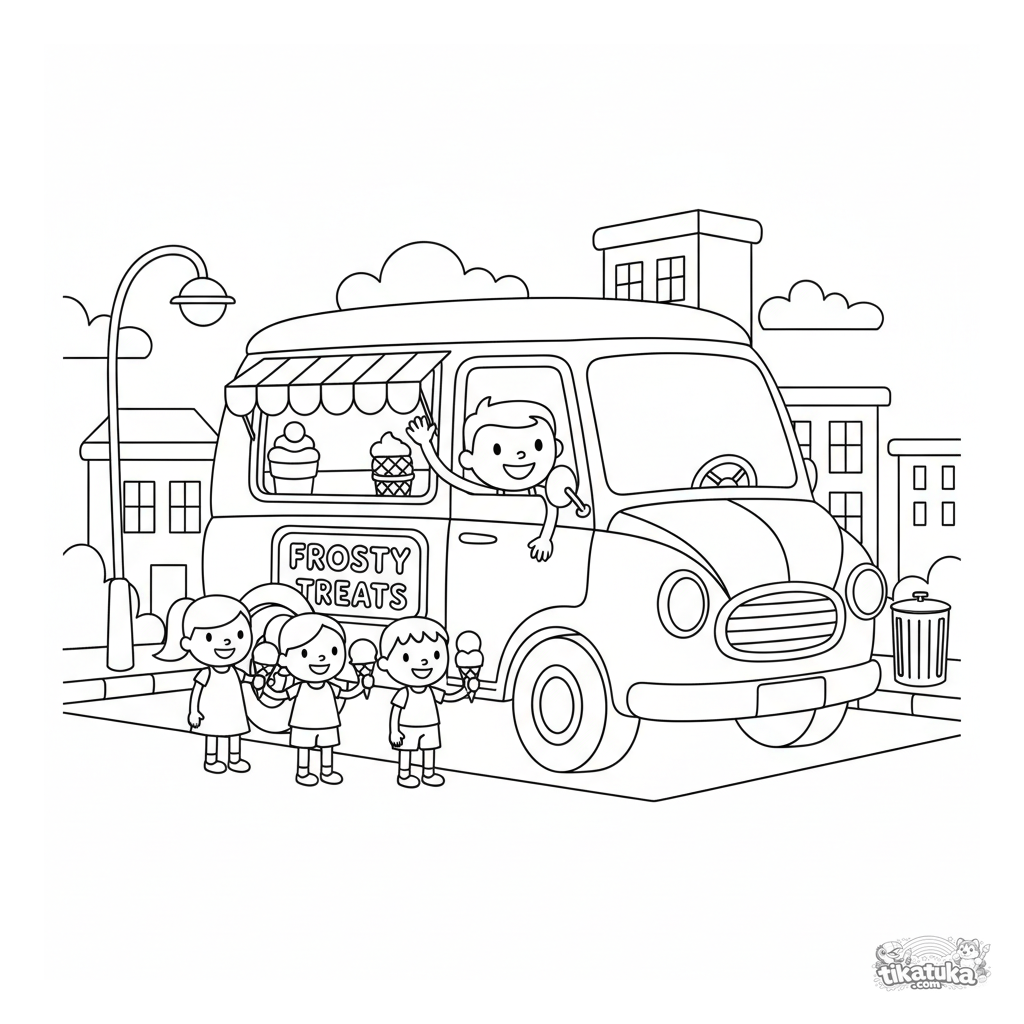 Página para colorear para niños de 4-6 años: una furgoneta de helados retro en una calle de la ciudad. Un conductor alegre sirve golosinas.
