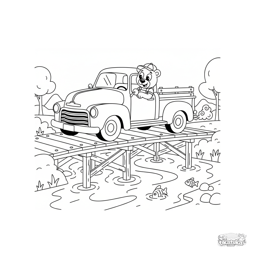 Página para colorear para niños 4-6: una camioneta retro cruza un puente de madera sobre un gran río. Un conductor oso amistoso mira con curiosidad. Formas simples, contornos claros.