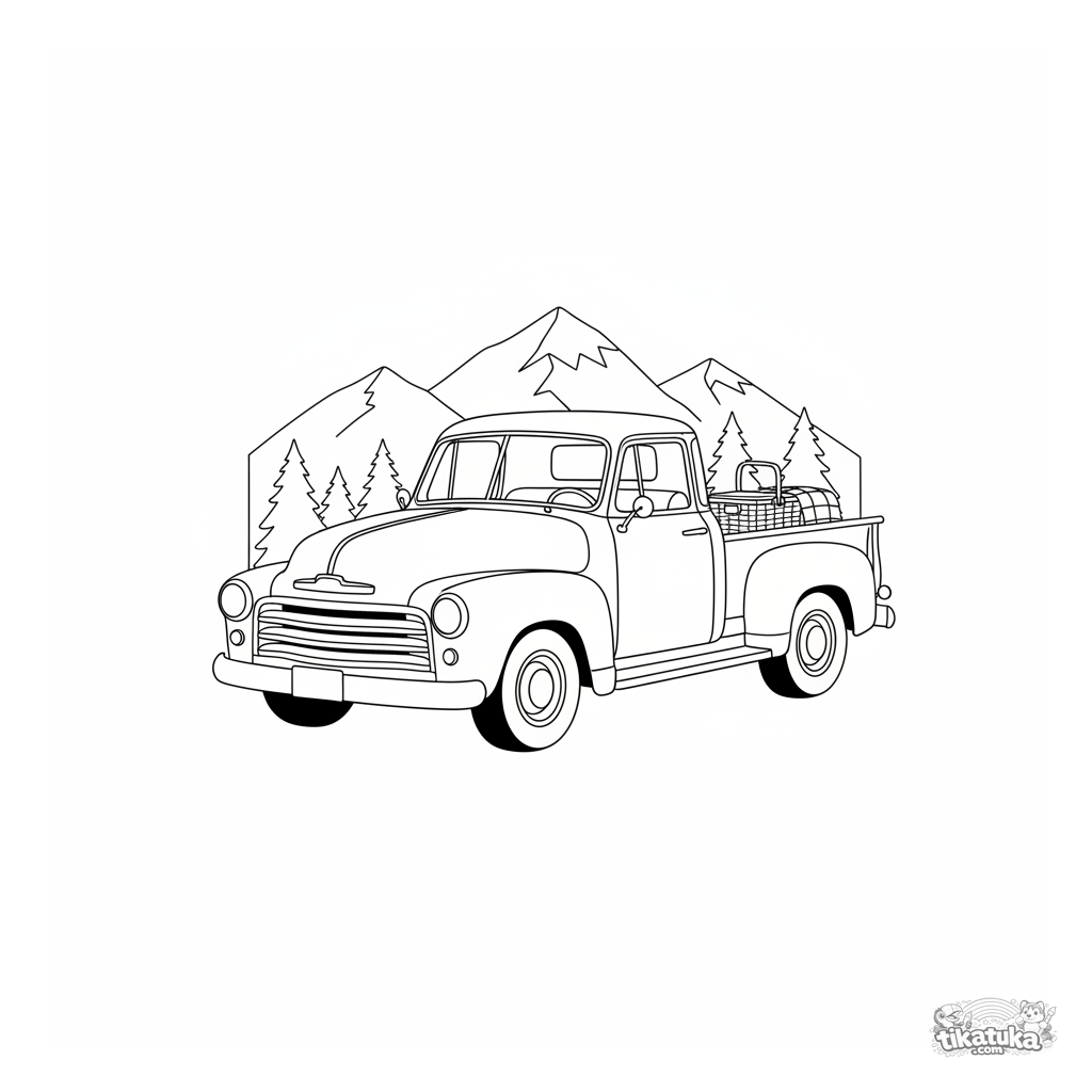 Página para colorear para niños: una camioneta retro de los años 50 estacionada en un mirador de montaña. Para niños de 4 a 6 años.