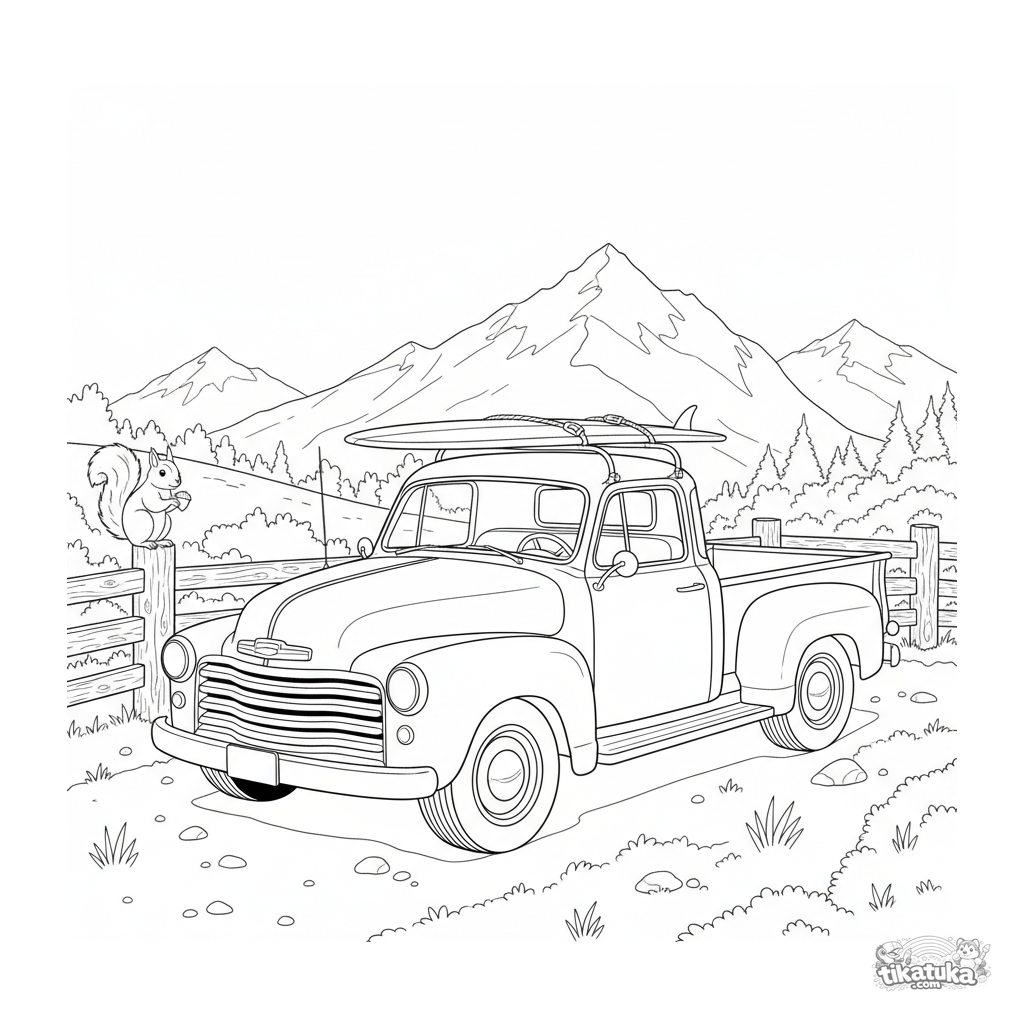 Página detallada para colorear para niños 7-12 años: una camioneta retro con tabla de surf en el techo está aparcada en un mirador de montaña. Estilo realista.