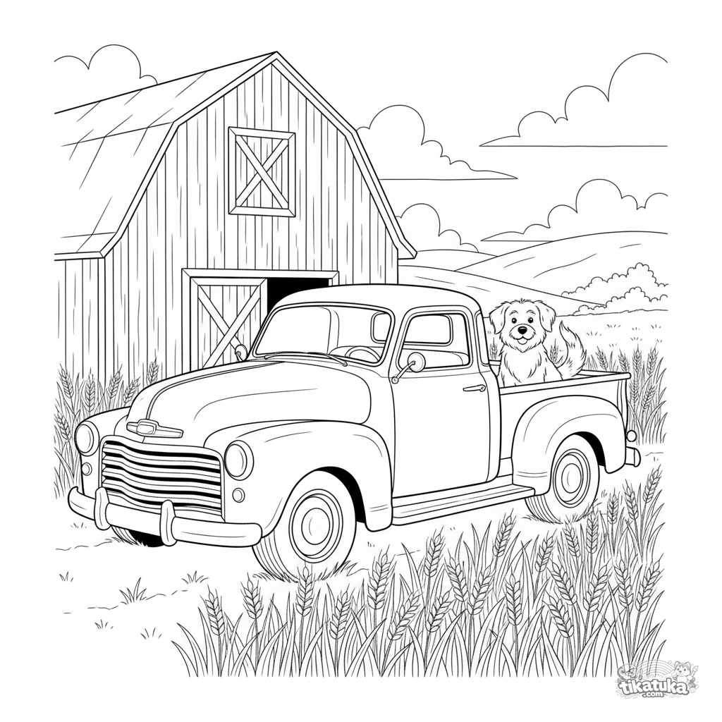 Página para colorear para niños de 4-6 años: una camioneta retro de los años 50 estacionada junto a un granero de madera en un campo de trigo dorado.