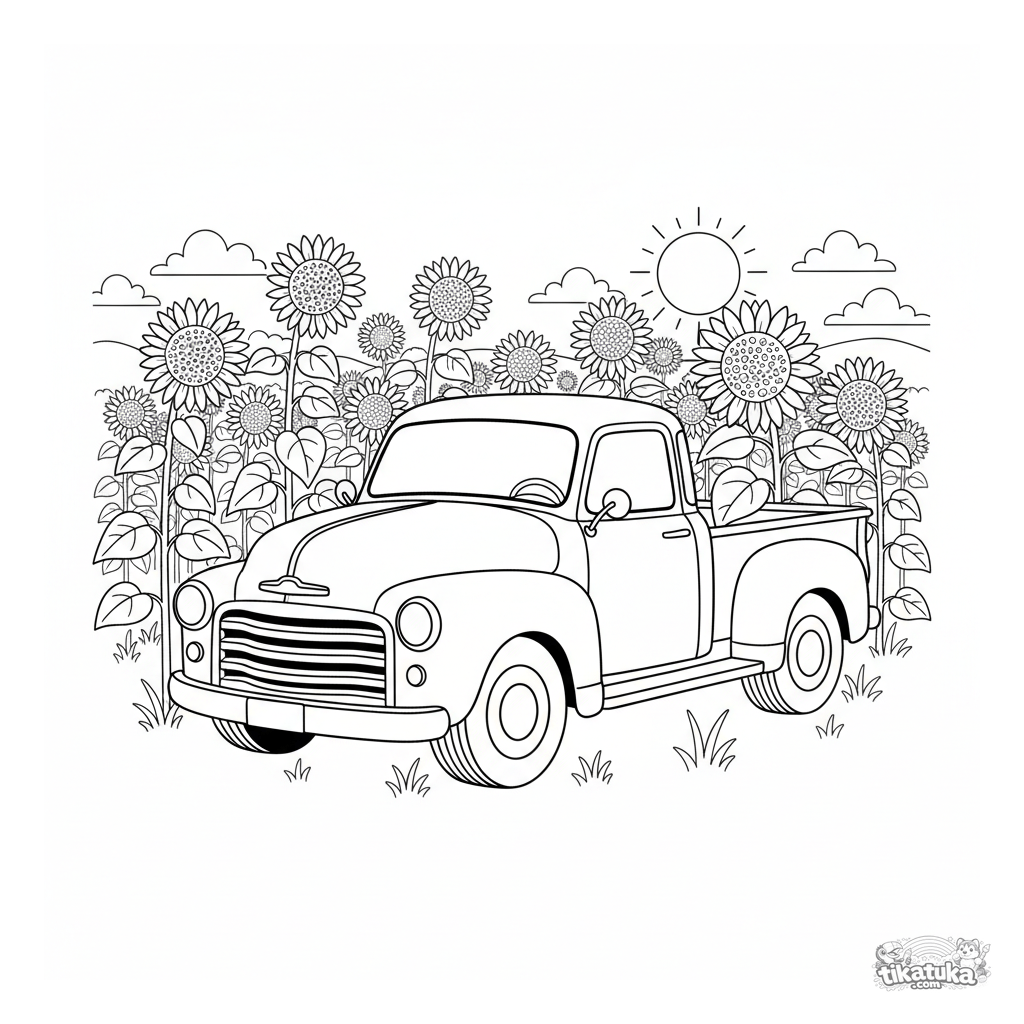 Página para colorear para niños: una camioneta retro estacionada en un campo de altos girasoles. Para niños de 4-6 años.