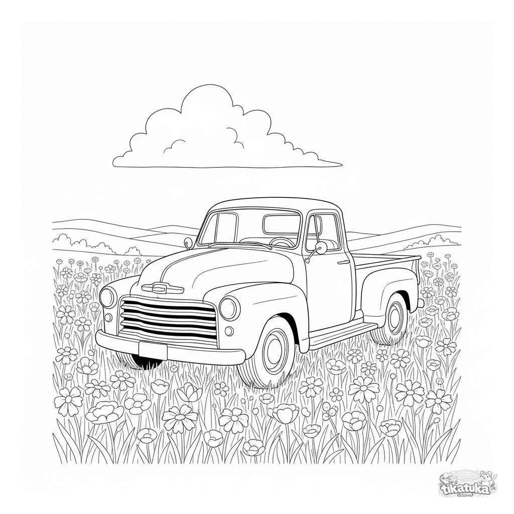 Página para colorear para niños de 4-6 años: una camioneta retro de los años 50 estacionada en un campo de flores silvestres. Dibujo detallado pero claro.