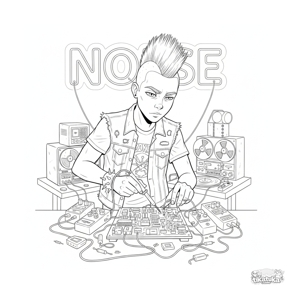 Página para colorear para niños 10-12: un hacker de estilo punk en un sótano soldando un sintetizador casero. Escena compleja con letrero de neón y equipo de audio.