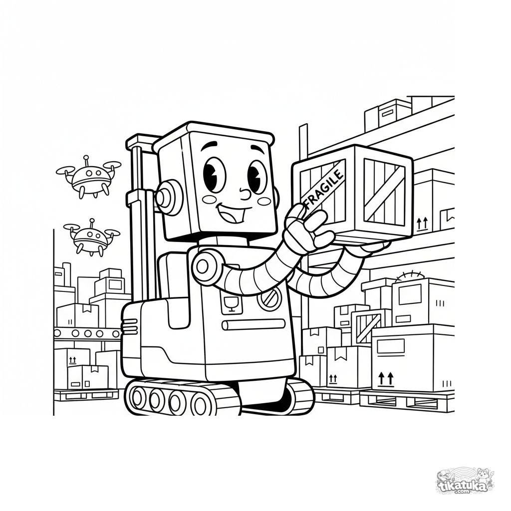 Página para colorear para niños 7-9: un robot montacargas retro de dibujos animados trabajando en un almacén, moviendo cajas. Escena dinámica.
