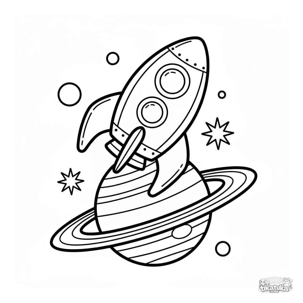 Página simple para colorear para niños pequeños 2-3: un cohete retro con grandes aletas vuela alrededor de un planeta gigante anillado. Formas grandes, muy pocos detalles, márgenes amplios.