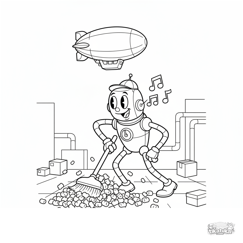 Página para colorear para niños 4-6: un robot conserje alegre en estilo retro barre confeti en un almacén. Extremidades flexibles, ojos expresivos.