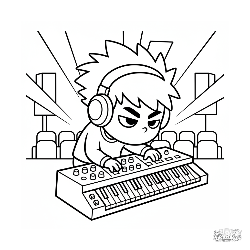 Página para colorear para preadolescentes de 7-9 años: un músico toca un sintetizador vintage en un escenario de sala de conciertos con haces de luz.
