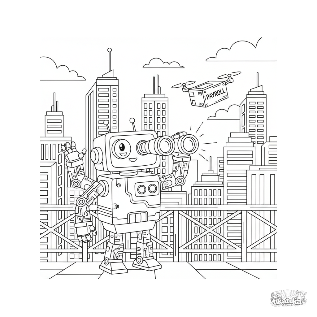 Página para colorear de estilo futurista: un robot asistente en un balcón con un visor óptico busca un dron de nómina. Escena detallada con rascacielos para niños de 10-12 años.