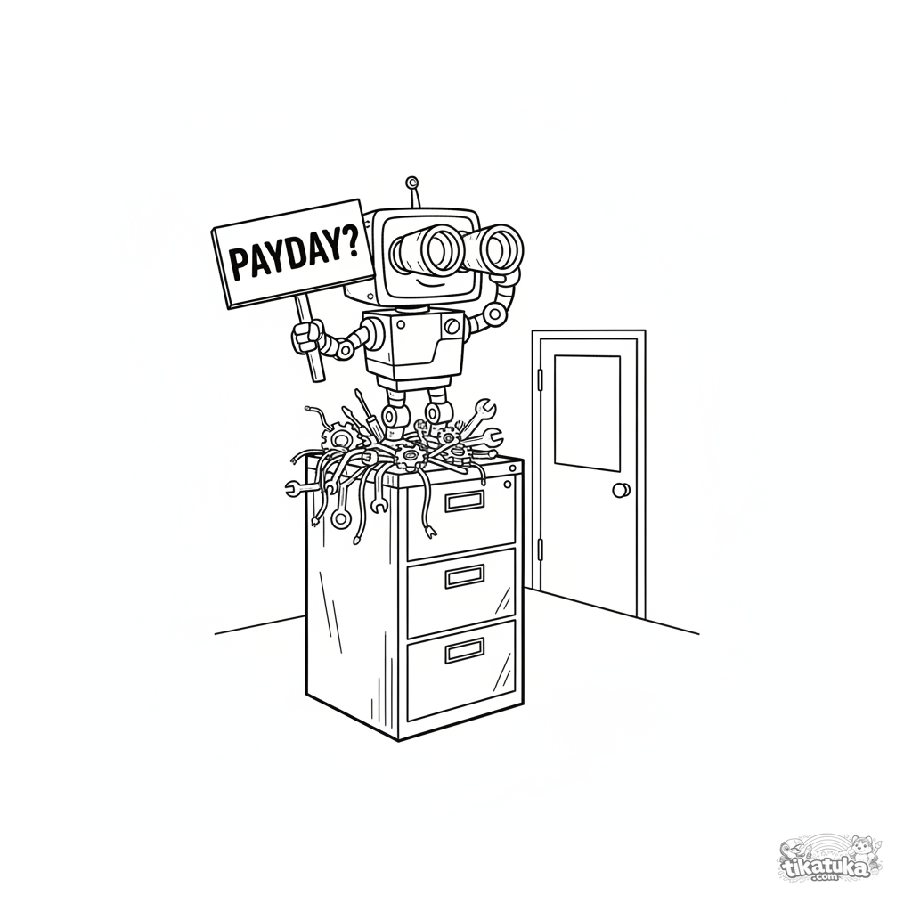Página para colorear para niños 10-12: un robot asistente en un archivador con ojos telescópicos busca el departamento de nóminas. Escena tecnológica divertida en estilo cómic.