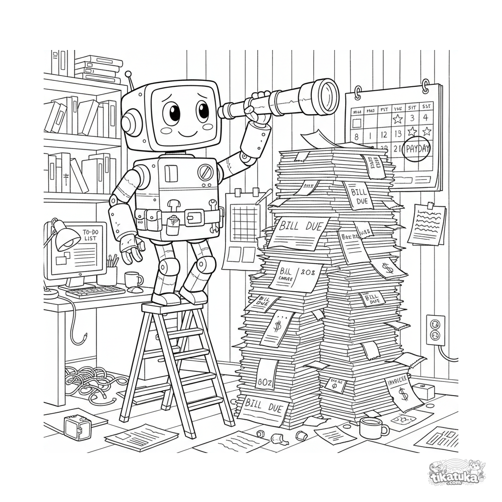 Página para colorear para niños 10-12 años: un robot amigable en una escalera hace un periscopio de cartón para ver el día de pago en un calendario. Escena de meme divertida y detallada.