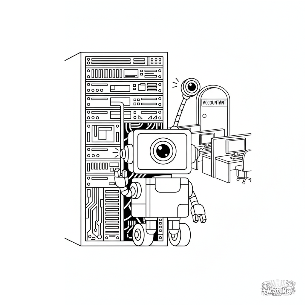 Página para colorear para niños 10-12: un robot asistente asomándose de un rack de servidores con periscopio, buscando su salario. Escena detallada en estilo novela gráfica.