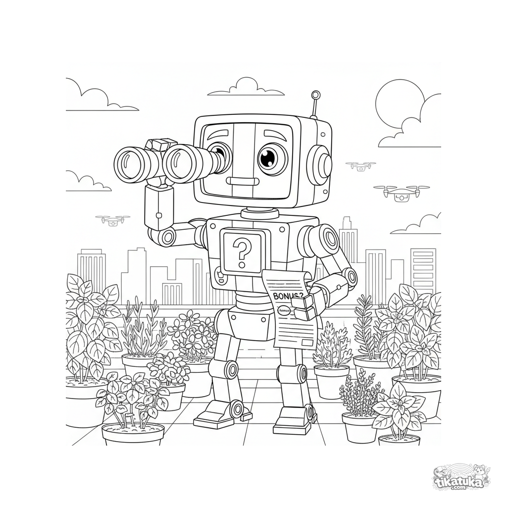 Página para colorear para preadolescentes: un robot asistente amigable con prismáticos en un jardín de azotea, buscando un dron de entrega. Escena detallada en estilo técnico de plano con humor.