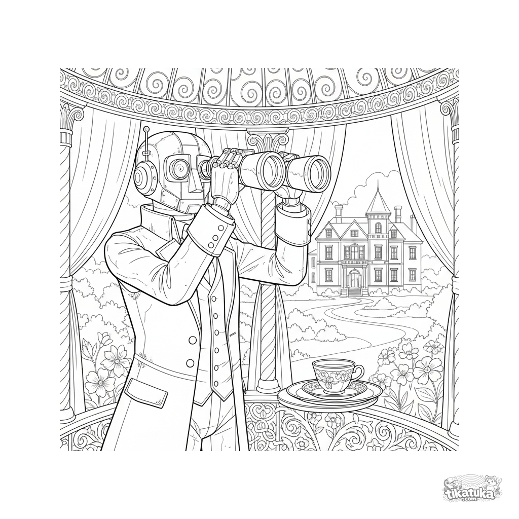 Página para colorear para niños 10-12: un robot mayordomo estilo steampunk con prismáticos observa desde una glorieta. Escena detallada con toques humorísticos.