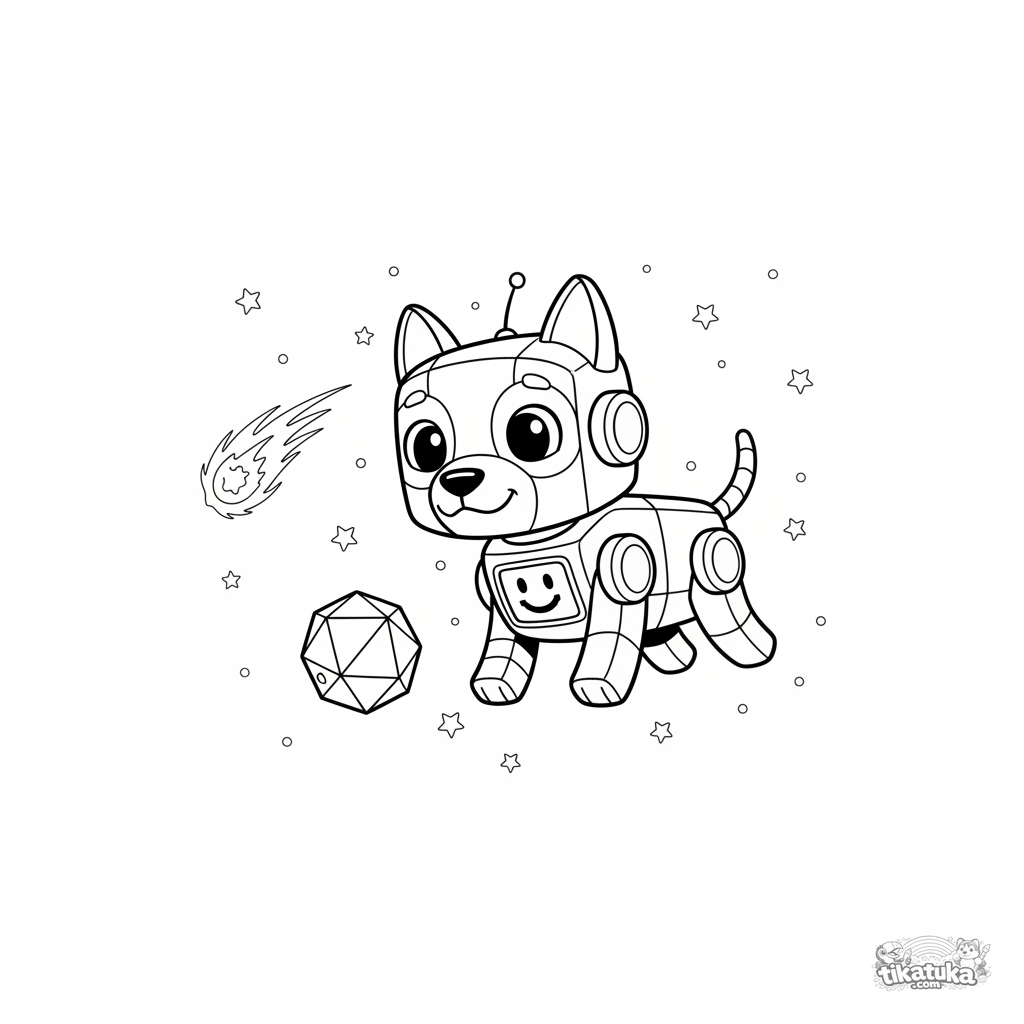Página para colorear para 7-9 años: un alegre perro robot de estilo vectorial plano juega a buscar basura espacial cerca de un cometa en el espacio estrellado.
