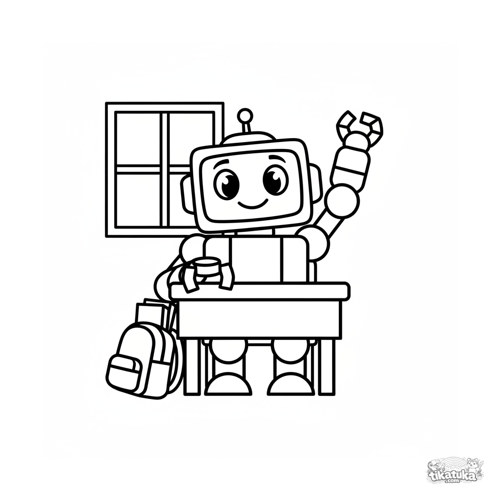 Página para colorear simple para niños pequeños 2-3: un robot estudiante se sienta en un pupitre y levanta la mano.