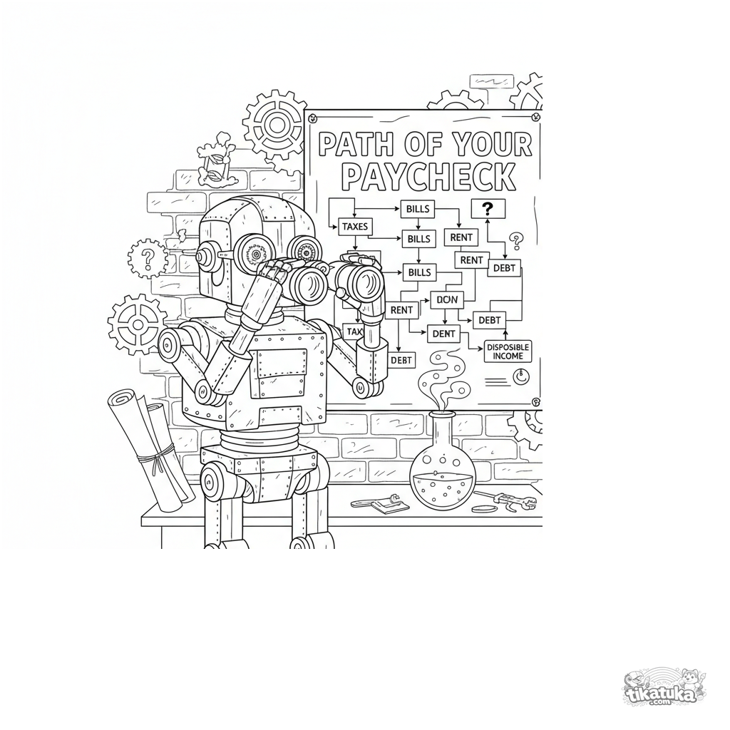 Página para colorear para niños 10-12: un robot vintage con monóculo y prismáticos complejos estudia un confuso diagrama 'Camino de tu Sueldo' en un laboratorio.