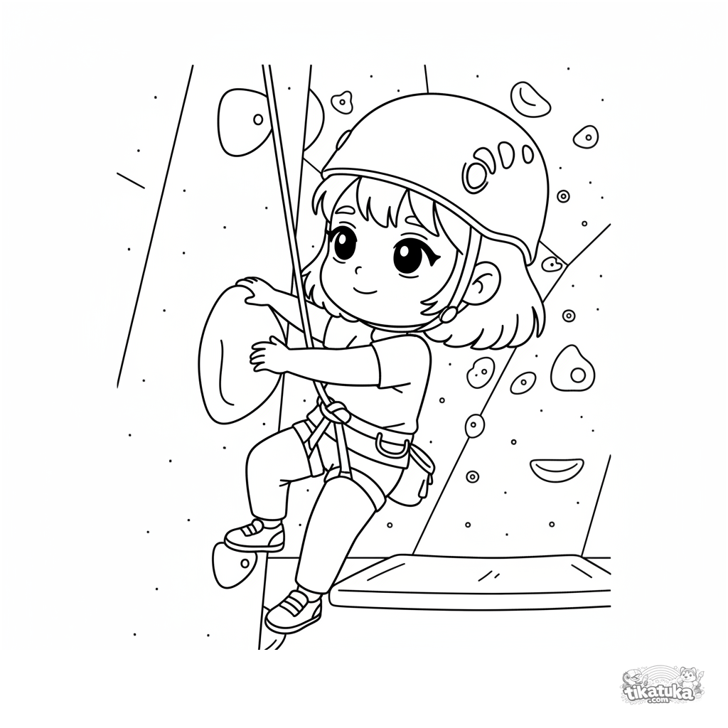 Página para colorear para niños: un niño escala en una pared interior de un gimnasio. Para 4-6 años, escena interesante.
