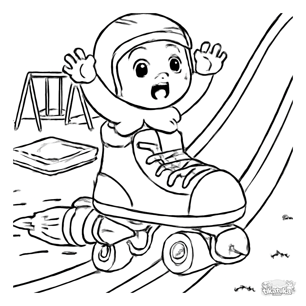 Divertida página para colorear de un patín con cohete deslizándose por un tobogán. Para niños de 5 a 8 años. Imagen dinámica del vehículo completo.