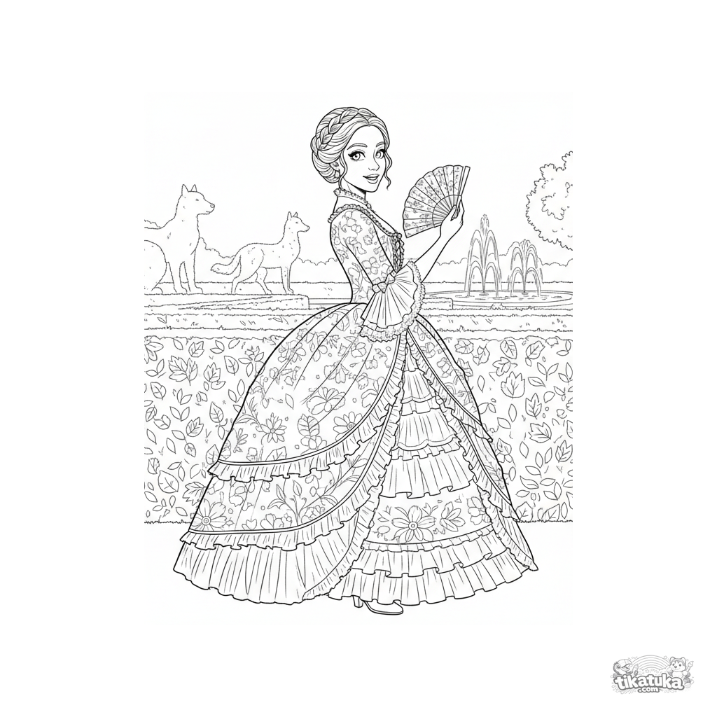 Página compleja para colorear para niñas 10-12 años: vestido histórico estilo rococó en un laberinto de jardín. Volantes en capas, fondo detallado.