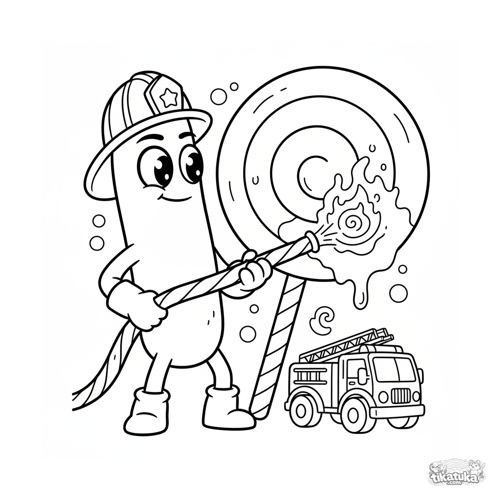Página para colorear para niños 7-9: una bacteria con forma de bastón bombero extingue un fuego de azúcar en una piruleta con una manguera de regaliz. Escena dinámica en estilo cómic aventura.