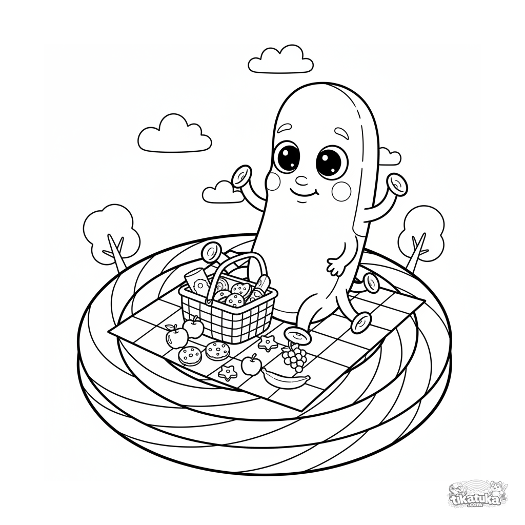 Página para colorear para niños de 4-6 años: una bacteria bastón amigable prepara un picnic sobre una manta en una piruleta. Estilo de marioneta suave.