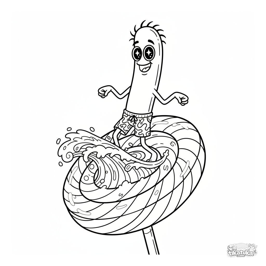 Página detallada para colorear para niños mayores de 10-12 años: una bacteria en forma de bastón en bañador atrapa una ola de azúcar en una piruleta arcoíris. Escena dinámica, alto detalle.