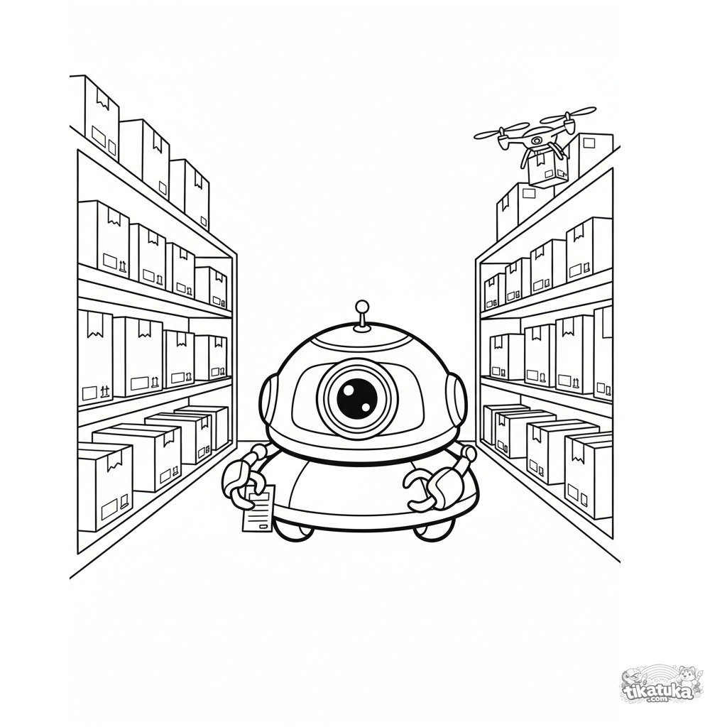 Página para colorear para niños de 4 a 6 años: un robot con ruedas escanea cajas en un almacén. Contornos claros, detalle moderado.