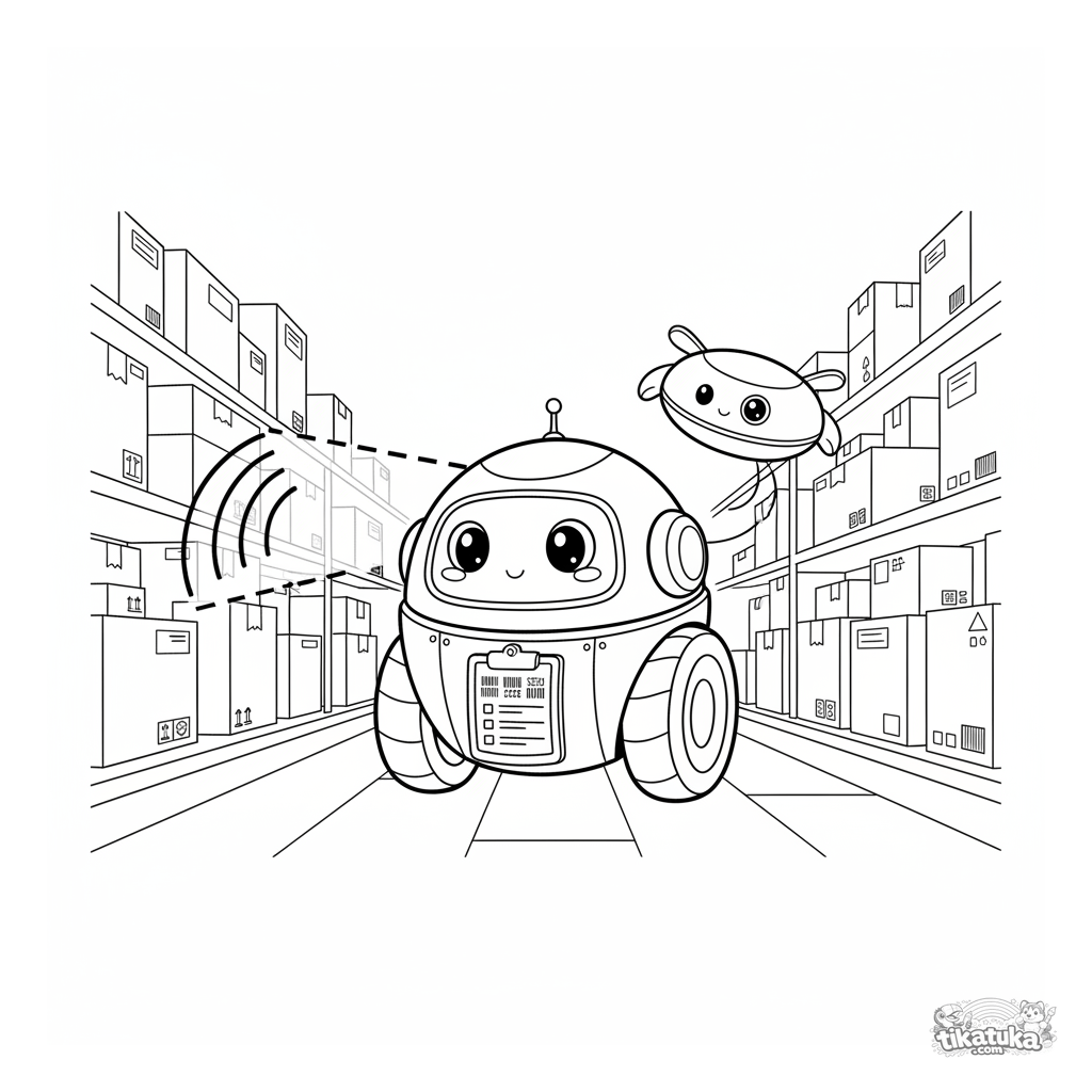 Página para colorear para niños de 4-6 años: un robot redondo con ruedas rueda por un pasillo de almacén, escaneando códigos de barras en cajas. Un dron ayudante vuela junto a él. Formas geométricas limpias.