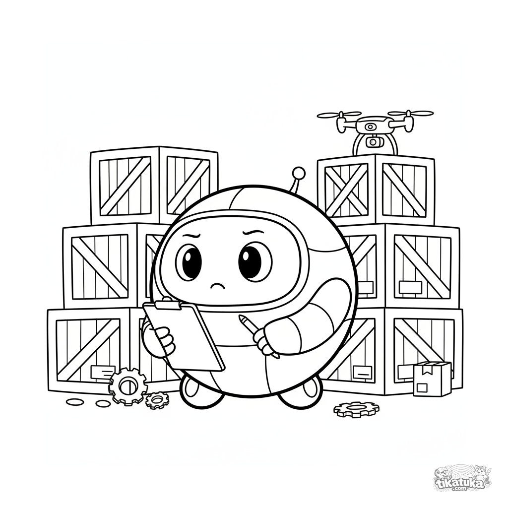 Página para colorear para niños 4-6: un robot redondo que rueda verifica el inventario con una tabla, entre pilas altas de cajones en un almacén.