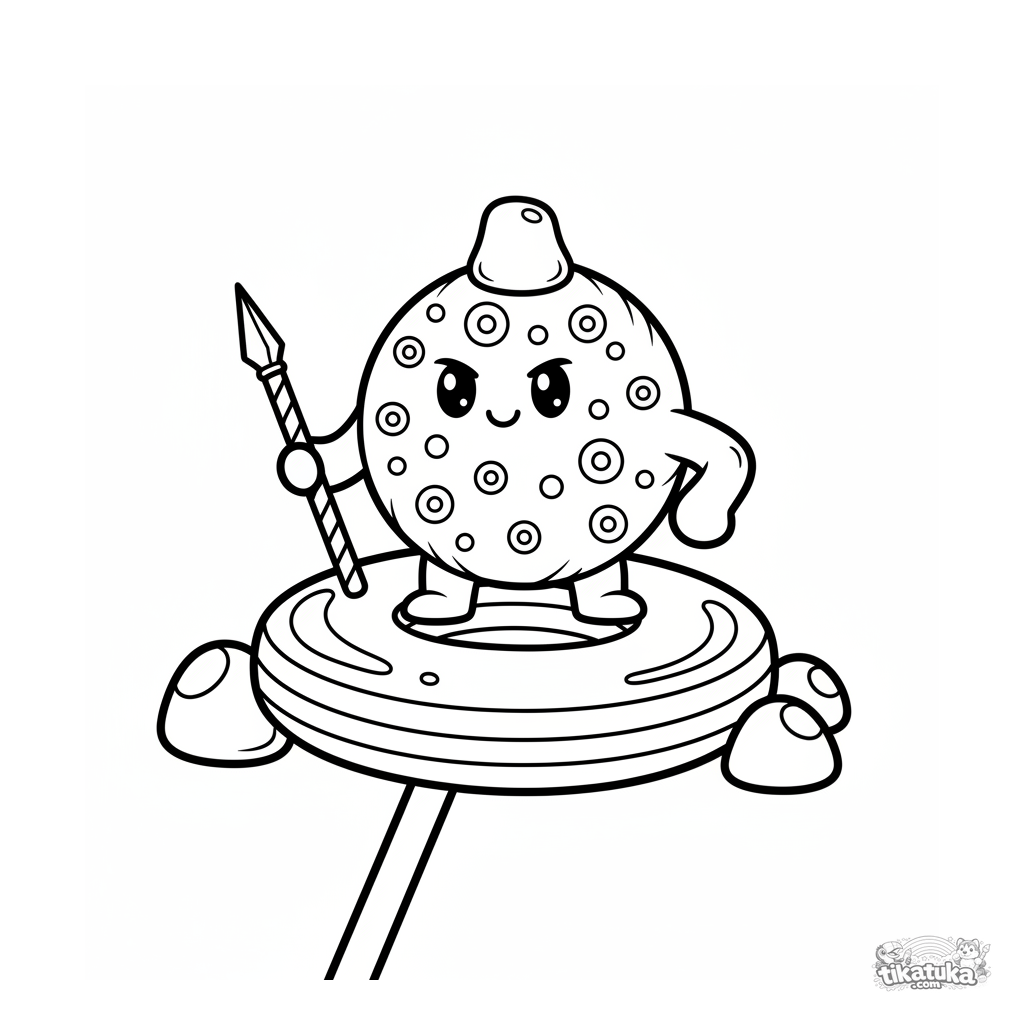 Página para colorear simple para niños pequeños de 2-3 años: un microbio burbuja guardián de peluche parado en un pirulito. Formas grandes, pocos detalles.