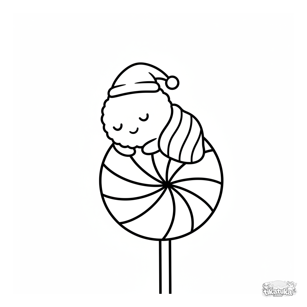 Página para colorear simple para bebés 2-3: un microbio redondo con gorro de dormir durmiendo en una piruleta. Formas grandes, pocos detalles.