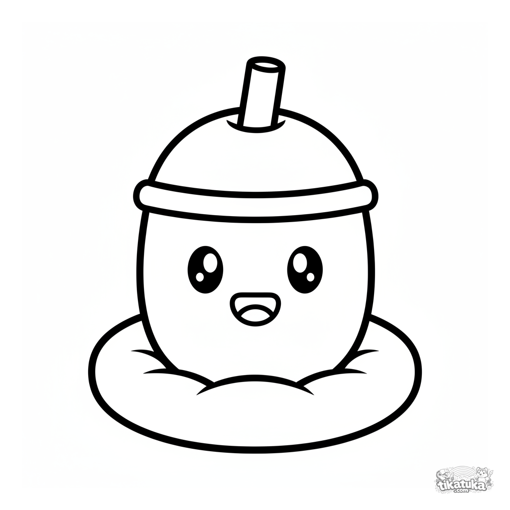Página para colorear para niños pequeños: una taza grande y redonda de boba con cara sonriente en un cojín suave. Diseño kawaii simple, perfecto para 2-3 años.