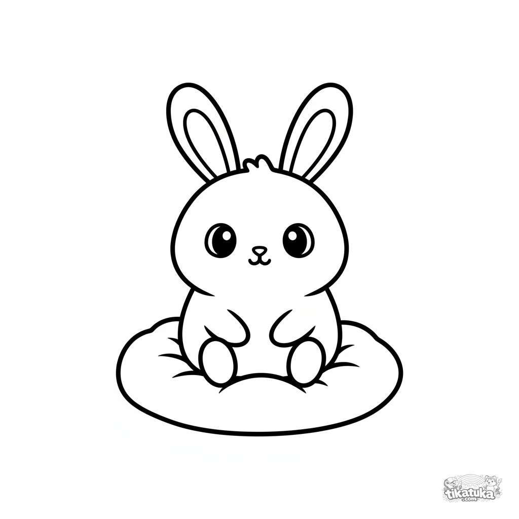 Página para colorear para los más pequeños: un conejo redondo con orejas largas sentado en un cojín. Ojos grandes y amables y un contorno simple para 2-3 años.
