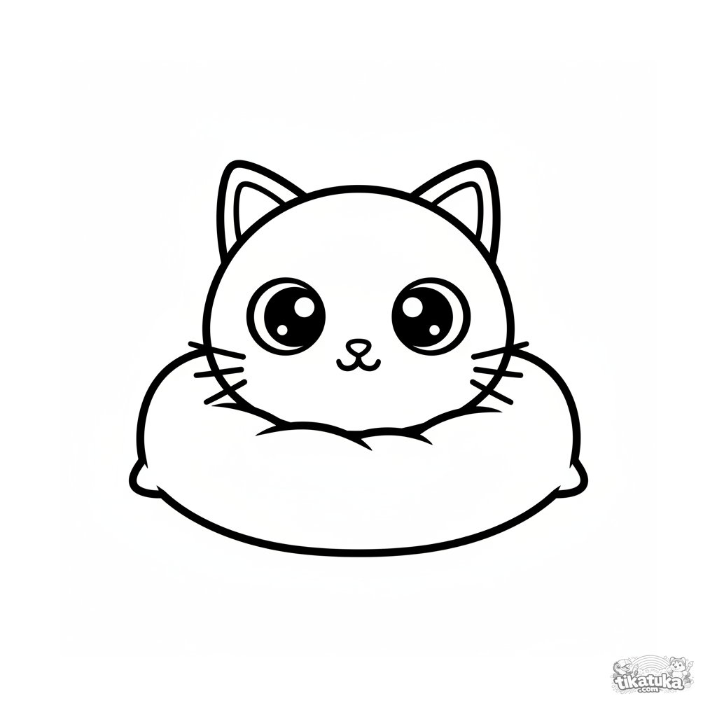 Página para colorear súper simple para niños de 2 años: una cara redonda y sonriente de gato en un almohadón. Ojos enormes, líneas simples.