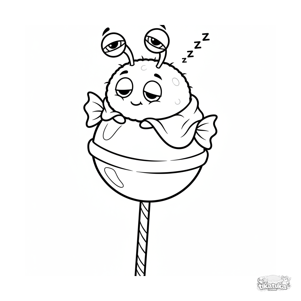 Página para colorear simple para bebés 2-3 años: un microbio redondo de peluche con ojos divertidos en tallo duerme profundamente en una piruleta grande. Formas grandes, contornos gruesos.