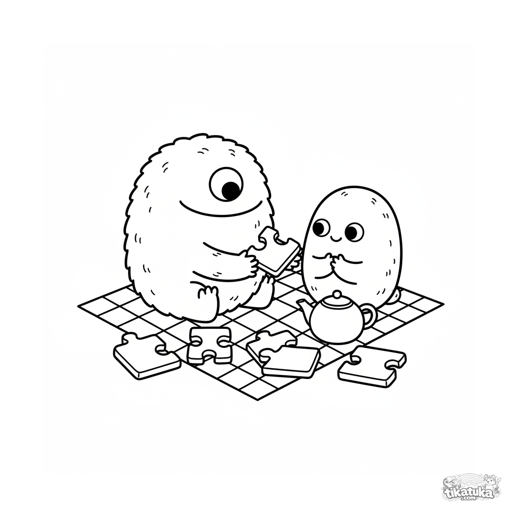 Página para colorear para niños 4-6: un monstruo chibi redondo comparte una galleta con forma de rompecabezas. Escena tierna sobre amistad.