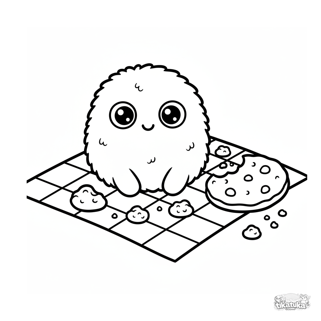 Página simple para colorear para niños pequeños de 2-3 años: un monstruo de peluche redondo con migas de galleta en un picnic.