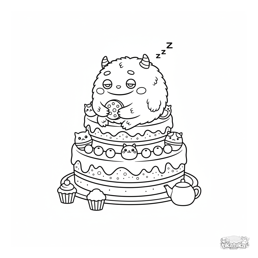 Página simple para colorear para bebés: un monstruo redondo durmiendo en un pastel grande en un picnic. Formas grandes, detalles mínimos, para 2-3 años.