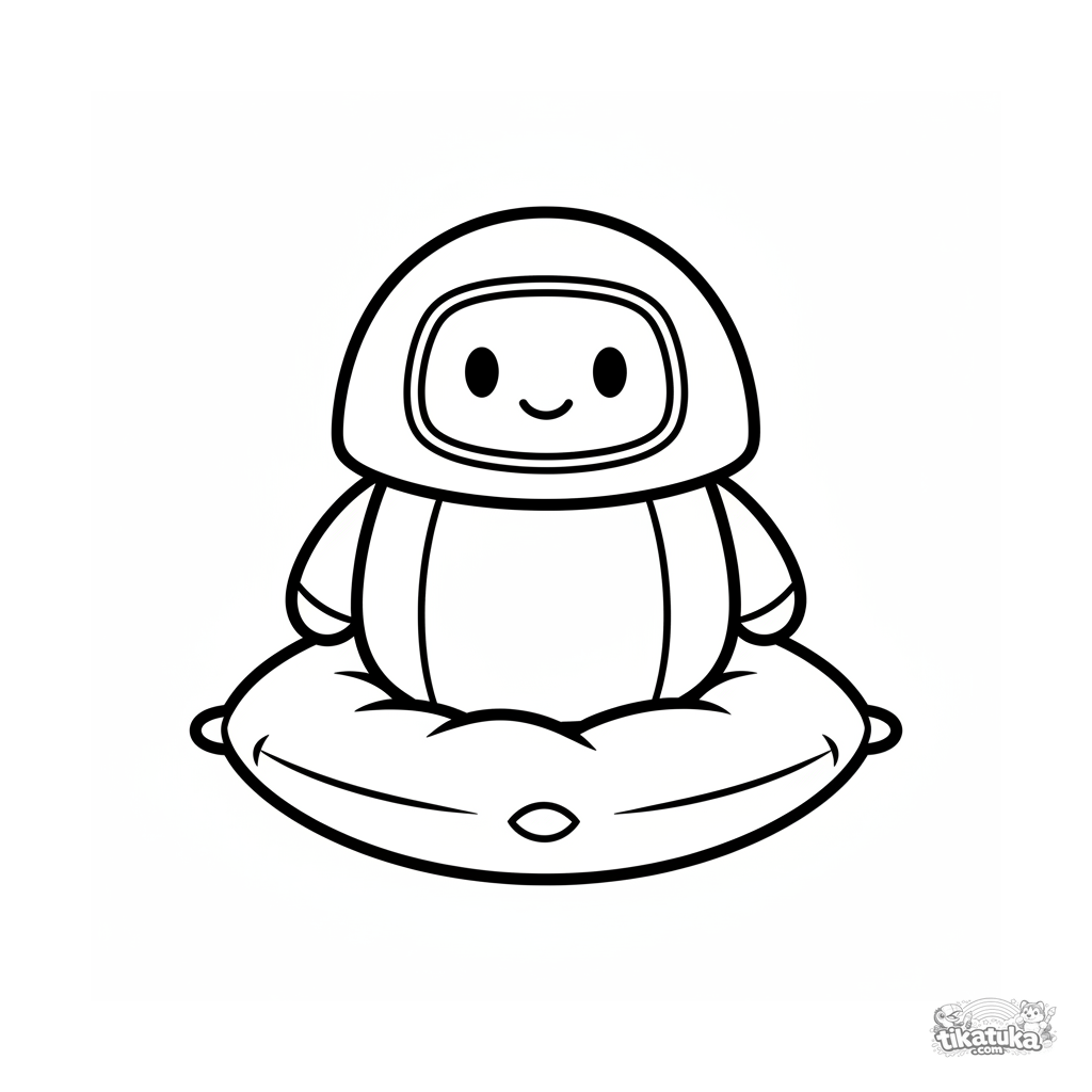Página para colorear para niños pequeños: un robot redondo y amigable sentado en un cojín suave. Áreas grandes cerradas, cara clara.