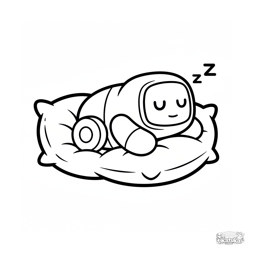 Página para colorear simple para niños de 2-3 años: un robot redondo y amigable duerme en un cojín suave. Formas grandes y claras.