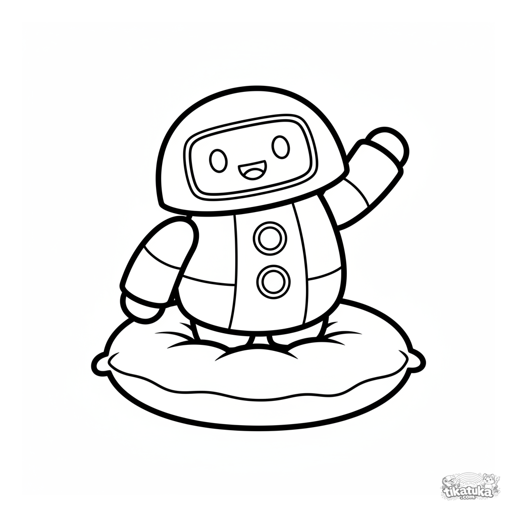 Página simple para colorear para 2-3 años: un robot redondo y amigable saludando parado en una almohada suave. Formas grandes y contornos claros.