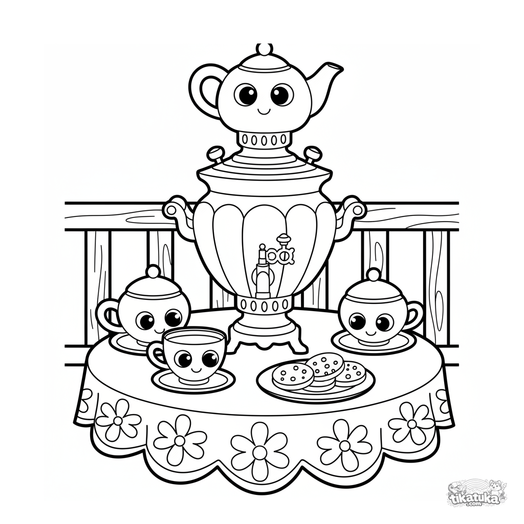 Página muy simple para colorear para niños pequeños: un samovar y un juego de té en una mesa del porche. Formas grandes y claras.