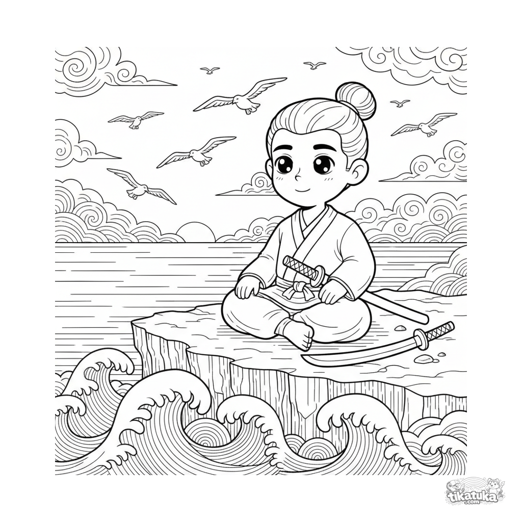 Página para colorear anime estilo novela gráfica: un aprendiz de samurái medita en un acantilado al amanecer. Escena detallada con océano, pájaros y olas para 10-12 años.