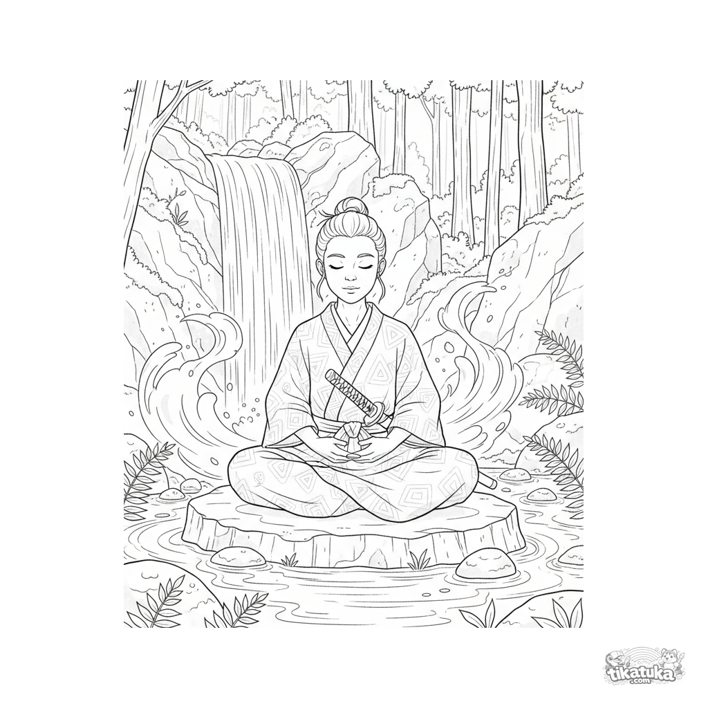 Página para colorear estilo anime tranquila y detallada para 10-12 años: un aprendiz de samurái medita bajo el torrente de una cascada forestal con una espada de práctica en su regazo.