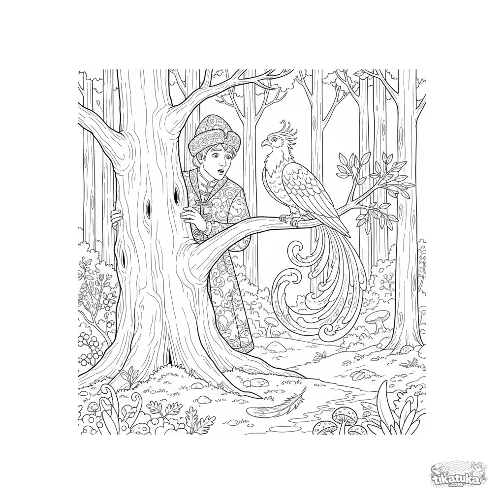 Página para colorear del cuento 'El Pájaro de Fuego'. El Príncipe Iván observa al pájaro mágico en el bosque. Para niños mayores de 7 a 12 años. Escena detallada con un roble y una pluma brillante.