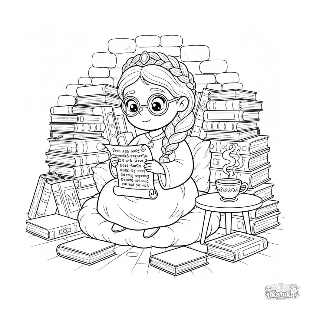 Página para colorear para niños 7-9: una princesa erudita en una acogedora torre biblioteca rodeada de libros y pergaminos.