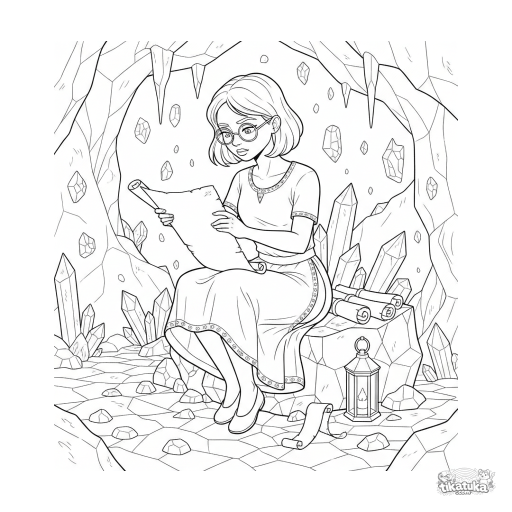 Página para colorear detallada para mayores 10-12: una princesa erudita lee un pergamino antiguo en una cueva de cristal brillante. Detalles intrincados.
